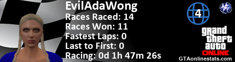 [URL=http://GTAonlinestats.com/showplayer/EvilAdaWong/2][IMG]http://GTAonlinestats.com/racesignature/EvilAdaWong/2/sig.png[/IMG][/URL]