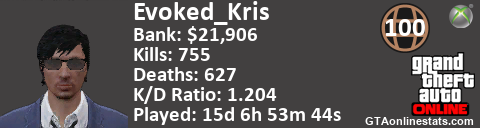 <a href="http://GTAonlinestats.com/showplayer/Evoked_Kris"><img src="http://GTAonlinestats.com/randomsignature/Evoked_Kris/sig.png" alt="Evoked_Kris" border="0" /></a>