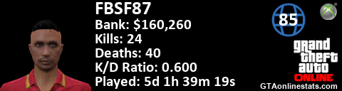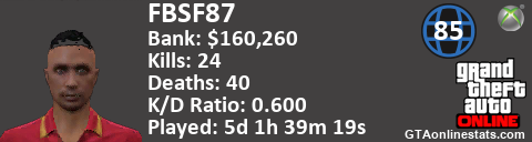 [URL=http://GTAonlinestats.com/showplayer/FBSF87][IMG]http://GTAonlinestats.com/signature/FBSF87/sig.png[/IMG][/URL]