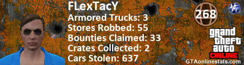 [URL=http://GTAonlinestats.com/showplayer/FLexTacY][IMG]http://GTAonlinestats.com/crimesignature/FLexTacY/sig.png[/IMG][/URL]
