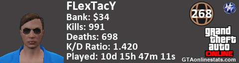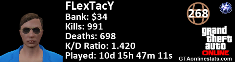 [URL=http://GTAonlinestats.com/showplayer/FLexTacY][IMG]http://GTAonlinestats.com/greysignature/FLexTacY/sig.png[/IMG][/URL]