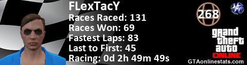<a href="http://GTAonlinestats.com/showplayer/FLexTacY"><img src="http://GTAonlinestats.com/racesignature/FLexTacY/sig.png" alt="FLexTacY" border="0" /></a>