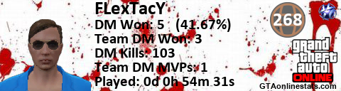 [URL=http://GTAonlinestats.com/showplayer/FLexTacY][IMG]http://GTAonlinestats.com/dmsignature/FLexTacY/sig.png[/IMG][/URL]