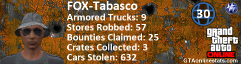 [URL=http://GTAonlinestats.com/showplayer/FOX-Tabasco][IMG]http://GTAonlinestats.com/crimesignature/FOX-Tabasco/sig.png[/IMG][/URL]