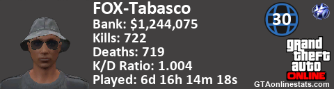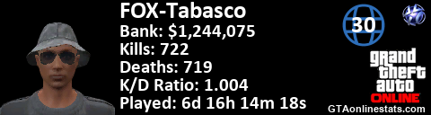 <a href="http://GTAonlinestats.com/showplayer/FOX-Tabasco"><img src="http://GTAonlinestats.com/signature/FOX-Tabasco/sig.png" alt="FOX-Tabasco" border="0" /></a>