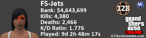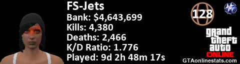 [URL=http://GTAonlinestats.com/showplayer/FS-Jets/2][IMG]http://GTAonlinestats.com/signature/FS-Jets/2/sig.png[/IMG][/URL]