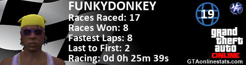 <a href="http://GTAonlinestats.com/showplayer/FUNKYDONKEY"><img src="http://GTAonlinestats.com/racesignature/FUNKYDONKEY/sig.png" alt="FunkyDonkey" border="0" /></a>