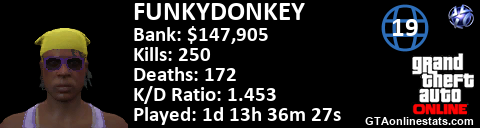 <a href="http://GTAonlinestats.com/showplayer/FUNKYDONKEY"><img src="http://GTAonlinestats.com/signature/FUNKYDONKEY/sig.png" alt="FunkyDonkey" border="0" /></a>