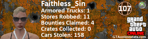[URL=http://GTAonlinestats.com/showplayer/Faithless_Sin/2][IMG]http://GTAonlinestats.com/randomsignature/Faithless_Sin/2/sig.png[/IMG][/URL]