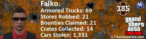 [URL=http://GTAonlinestats.com/showplayer/Falko.][IMG]http://GTAonlinestats.com/signature/Falko./sig.png[/IMG][/URL]