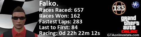 [URL=http://GTAonlinestats.com/showplayer/Falko.][IMG]http://GTAonlinestats.com/racesignature/Falko./sig.png[/IMG][/URL]