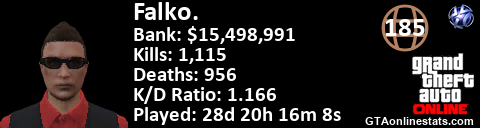 <a href="http://GTAonlinestats.com/showplayer/Falko."><img src="http://GTAonlinestats.com/dmsignature/Falko./sig.png" alt="Falko." border="0" /></a>