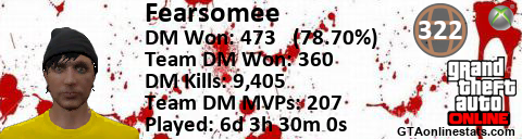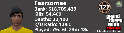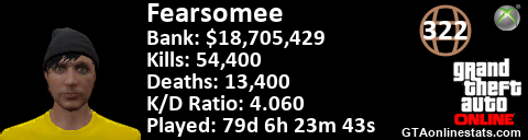<a href="http://GTAonlinestats.com/showplayer/Fearsomee"><img src="http://GTAonlinestats.com/dmsignature/Fearsomee/sig.png" alt="Fearsomee" border="0" /></a>