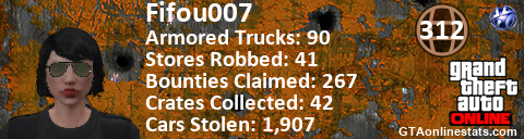 [URL=http://GTAonlinestats.com/showplayer/Fifou007][IMG]http://GTAonlinestats.com/crimesignature/Fifou007/sig.png[/IMG][/URL]