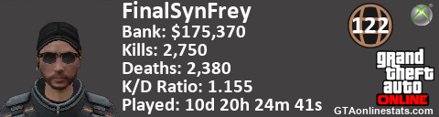 <a href="http://GTAonlinestats.com/showplayer/FinalSynFrey"><img src="http://GTAonlinestats.com/signature/FinalSynFrey/sig.png" alt="FinalSynFrey" border="0" /></a>