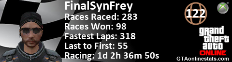 [URL=http://GTAonlinestats.com/showplayer/FinalSynFrey][IMG]http://GTAonlinestats.com/racesignature/FinalSynFrey/sig.png[/IMG][/URL]