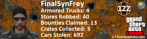 [URL=http://GTAonlinestats.com/showplayer/FinalSynFrey][IMG]http://GTAonlinestats.com/crimesignature/FinalSynFrey/sig.png[/IMG][/URL]
