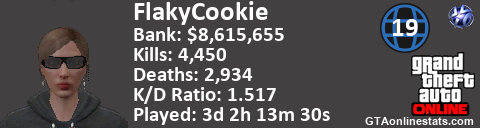 [URL=http://GTAonlinestats.com/showplayer/FlakyCookie/2][IMG]http://GTAonlinestats.com/dmsignature/FlakyCookie/2/sig.png[/IMG][/URL]