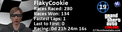 [URL=http://GTAonlinestats.com/showplayer/FlakyCookie/2][IMG]http://GTAonlinestats.com/racesignature/FlakyCookie/2/sig.png[/IMG][/URL]