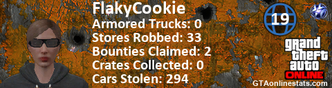 [URL=http://GTAonlinestats.com/showplayer/FlakyCookie/2][IMG]http://GTAonlinestats.com/crimesignature/FlakyCookie/2/sig.png[/IMG][/URL]
