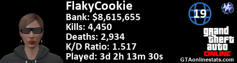 [URL=http://GTAonlinestats.com/showplayer/FlakyCookie/2][IMG]http://GTAonlinestats.com/greysignature/FlakyCookie/2/sig.png[/IMG][/URL]