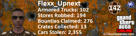[URL=http://GTAonlinestats.com/showplayer/Flexx_Upnext][IMG]http://GTAonlinestats.com/crimesignature/Flexx_Upnext/sig.png[/IMG][/URL]