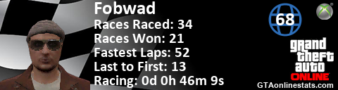 <a href="http://GTAonlinestats.com/showplayer/Fobwad"><img src="http://GTAonlinestats.com/racesignature/Fobwad/sig.png" alt="Fobwad" border="0" /></a>