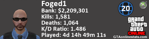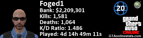<a href="http://GTAonlinestats.com/showplayer/Foged1/2"><img src="http://GTAonlinestats.com/signature/Foged1/2/sig.png" alt="Foged1" border="0" /></a>