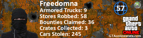 [URL=http://GTAonlinestats.com/showplayer/Freedomna][IMG]http://GTAonlinestats.com/crimesignature/Freedomna/sig.png[/IMG][/URL]