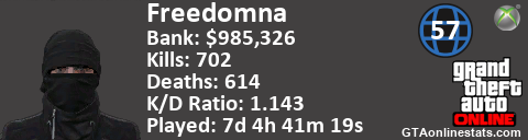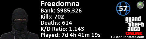 [URL=http://GTAonlinestats.com/showplayer/Freedomna][IMG]http://GTAonlinestats.com/dmsignature/Freedomna/sig.png[/IMG][/URL]