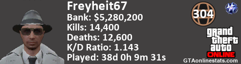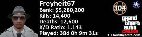 <a href="http://GTAonlinestats.com/showplayer/Freyheit67"><img src="http://GTAonlinestats.com/greysignature/Freyheit67/sig.png" alt="Freyheit67" border="0" /></a>