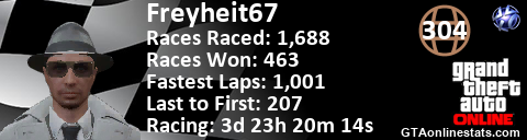 [URL=http://GTAonlinestats.com/showplayer/Freyheit67][IMG]http://GTAonlinestats.com/racesignature/Freyheit67/sig.png[/IMG][/URL]