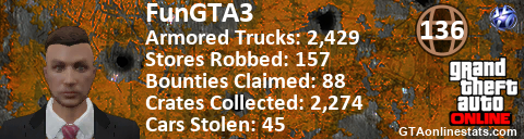 [URL=http://GTAonlinestats.com/showplayer/FunGTA3][IMG]http://GTAonlinestats.com/crimesignature/FunGTA3/sig.png[/IMG][/URL]