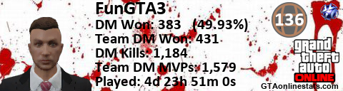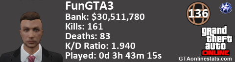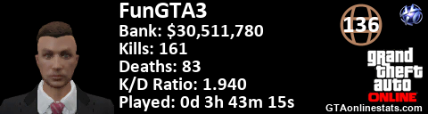 [URL=http://GTAonlinestats.com/showplayer/FunGTA3][IMG]http://GTAonlinestats.com/signature/FunGTA3/sig.png[/IMG][/URL]