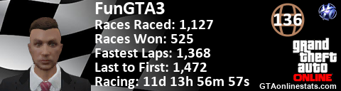 [URL=http://GTAonlinestats.com/showplayer/FunGTA3][IMG]http://GTAonlinestats.com/racesignature/FunGTA3/sig.png[/IMG][/URL]