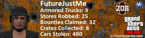 [URL=http://GTAonlinestats.com/showplayer/FutureJustMe][IMG]http://GTAonlinestats.com/crimesignature/FutureJustMe/sig.png[/IMG][/URL]