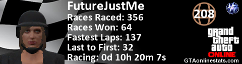 [URL=http://GTAonlinestats.com/showplayer/FutureJustMe][IMG]http://GTAonlinestats.com/racesignature/FutureJustMe/sig.png[/IMG][/URL]