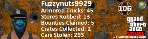 <a href="http://GTAonlinestats.com/showplayer/Fuzzynuts9929/2"><img src="http://GTAonlinestats.com/randomsignature/Fuzzynuts9929/2/sig.png" alt="Fuzzynuts9929" border="0" /></a>