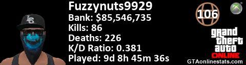 [URL=http://GTAonlinestats.com/showplayer/Fuzzynuts9929/2][IMG]http://GTAonlinestats.com/signature/Fuzzynuts9929/2/sig.png[/IMG][/URL]