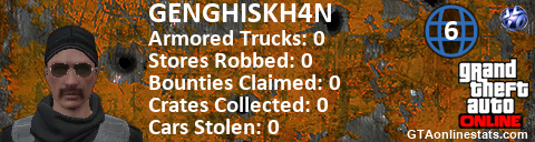 [URL=http://GTAonlinestats.com/showplayer/GENGHISKH4N/2][IMG]http://GTAonlinestats.com/crimesignature/GENGHISKH4N/2/sig.png[/IMG][/URL]