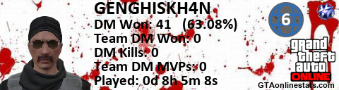 [URL=http://GTAonlinestats.com/showplayer/GENGHISKH4N/2][IMG]http://GTAonlinestats.com/dmsignature/GENGHISKH4N/2/sig.png[/IMG][/URL]