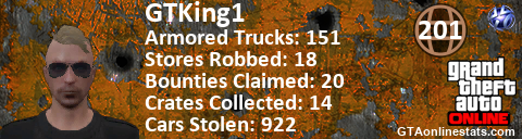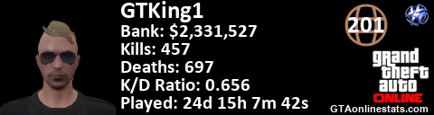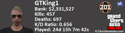 [URL=http://GTAonlinestats.com/showplayer/GTKing1/2][IMG]http://GTAonlinestats.com/signature/GTKing1/2/sig.png[/IMG][/URL]