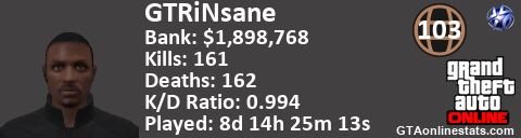 [URL=http://GTAonlinestats.com/showplayer/GTRiNsane][IMG]http://GTAonlinestats.com/signature/GTRiNsane/sig.png[/IMG][/URL]