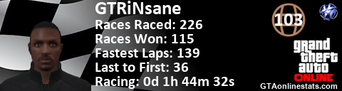 [URL=http://GTAonlinestats.com/showplayer/GTRiNsane][IMG]http://GTAonlinestats.com/racesignature/GTRiNsane/sig.png[/IMG][/URL]