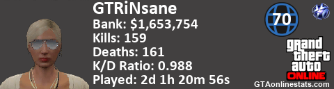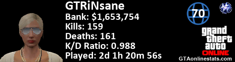 [URL=http://GTAonlinestats.com/showplayer/GTRiNsane/2][IMG]http://GTAonlinestats.com/signature/GTRiNsane/2/sig.png[/IMG][/URL]