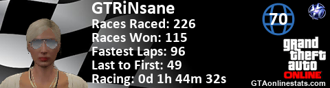 [URL=http://GTAonlinestats.com/showplayer/GTRiNsane/2][IMG]http://GTAonlinestats.com/racesignature/GTRiNsane/2/sig.png[/IMG][/URL]