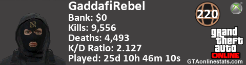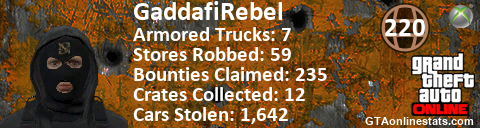 [URL=http://GTAonlinestats.com/showplayer/GaddafiRebel][IMG]http://GTAonlinestats.com/signature/GaddafiRebel/sig.png[/IMG][/URL]