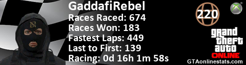 <a href="http://GTAonlinestats.com/showplayer/GaddafiRebel"><img src="http://GTAonlinestats.com/racesignature/GaddafiRebel/sig.png" alt="GaddafiRebel" border="0" /></a>