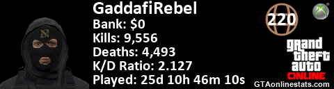 [URL=http://GTAonlinestats.com/showplayer/GaddafiRebel][IMG]http://GTAonlinestats.com/dmsignature/GaddafiRebel/sig.png[/IMG][/URL]