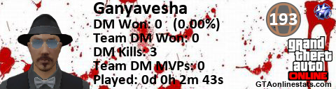 [URL=http://GTAonlinestats.com/showplayer/Ganyavesha][IMG]http://GTAonlinestats.com/dmsignature/Ganyavesha/sig.png[/IMG][/URL]